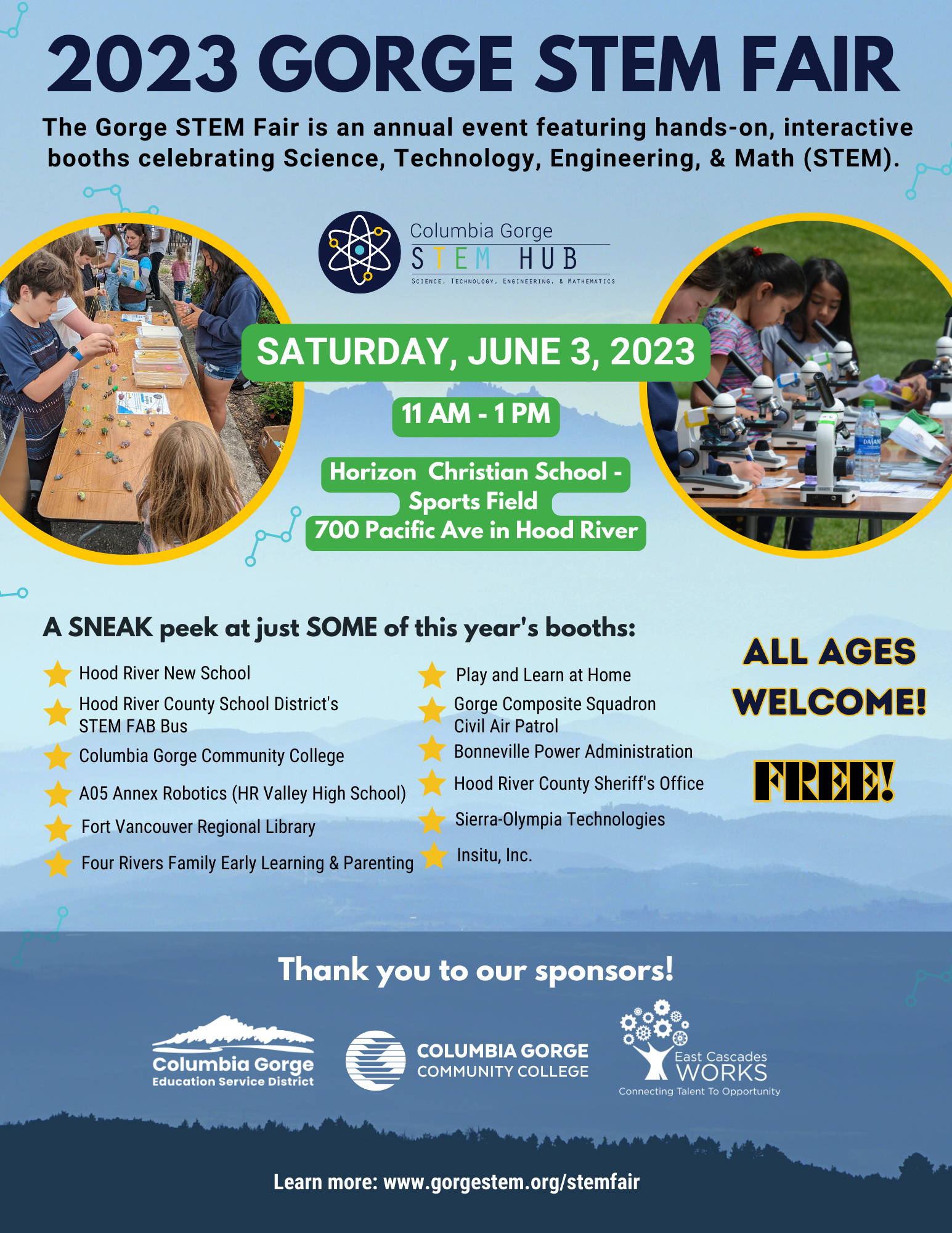 Mark your calendars for the 2023 Gorge STEM Fair! The 2023 Gorge STEM Fair will take place on Saturday, June 3rd. This free, outdoor, family-friendly event is hosted annually by the Columbia Gorge STEM Hub (a department of Columbia Gorge Education Service District) in close collaboration with many local companies, schools, and organizations. Everyone in the community is welcome!