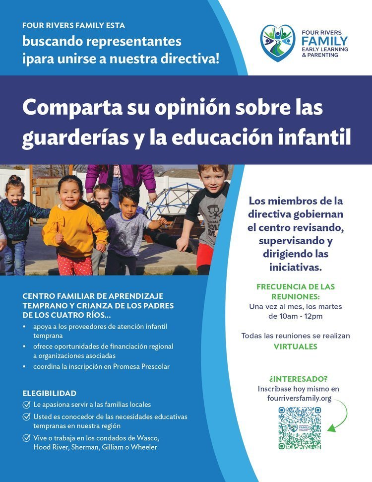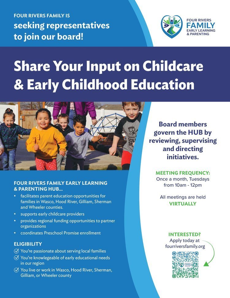 Four Rivers Family Early Learning and Parenting is seeking Board Members to join its Governance Board. The Hub’s mission is to support existing care and education programs, expand early care and education program proficiency and capacity, and align to improve planning, communication, and outcomes.